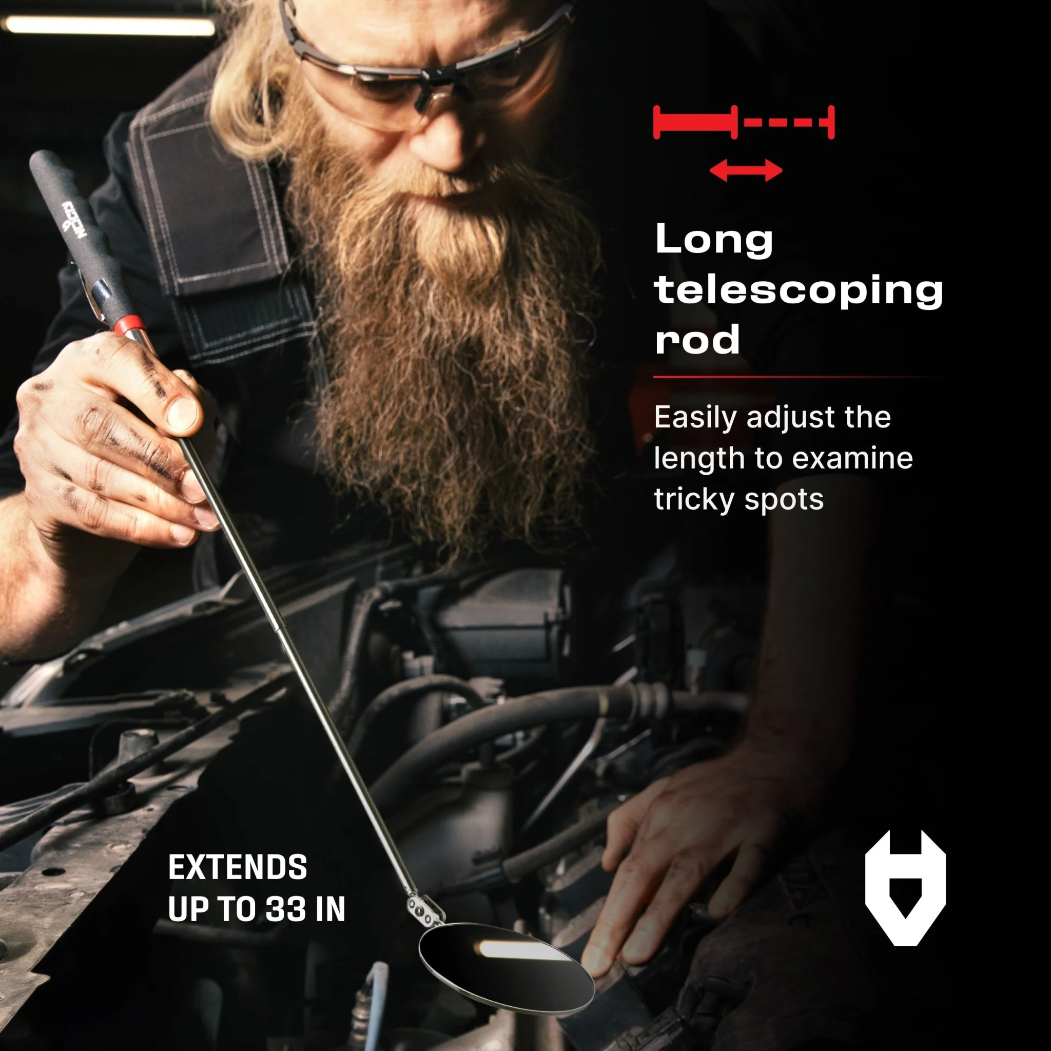 - STAINLESS STEEL BODY EXTENDS UP TO 30IN — Only 7in long when retracted, this compact, durable inspection mirror easily fits in your tool kit. It extends out up to 30in, making it easy to reach hard-to-reach areas.